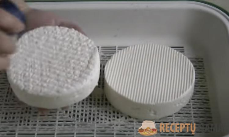 Išrūgų perteklius atsiskirs, po to masę reikia 10 minučių minkyti – būsimo krešulio kubeliai virs sūrio grūdeliais, taps elastingi. Perkelkite grūdelius į formas su drenažu – būtina nuleisti išrūgų perteklių. Palikite sūrį maždaug dviem valandoms, tada apverskite ir dar penkis kartus kas trisdešimt minučių apverskite. Tokiu būdu sūris savaime išsilygins be pernelyg didelio spaudimo.