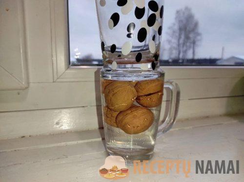 Pirmiausia paimkite tinkamą indą, į kurį galėsite sudėti riešutus. Supilkite riešutus į šį indą ir užpilkite vandeniu. Po to indą uždenkite dangčiu, kad riešutai būtų visiškai panardinti į skystį, ir palikite jį 1 valandai.