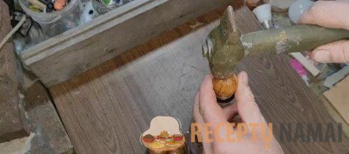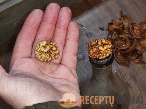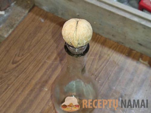 Tada jums reikės butelio tvirtu kakleliu, pavyzdžiui, nuo šampano. Ant butelio kaklelio vertikaliai uždėkite graikinį riešutą, kaip parodyta nuotraukoje. Viena ranka laikykite riešutą, o kita ranka švelniai plaktuku stuksenkite į kiauto viršų, kad jis įtrūktų.