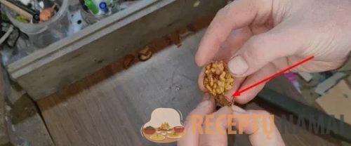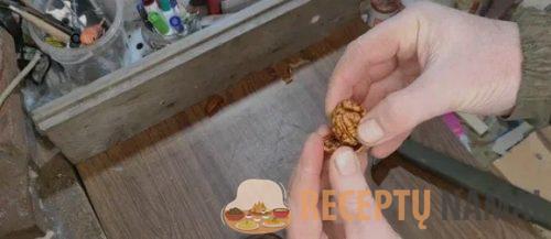 Kai kiautas įtrūks, atsargiai jį nuimkite. Dėl to, kad riešutas buvo vandenyje, jis liks nepažeistas ir nesutrupės. Paskutinis žingsnis – atsargiai nuimti graikinio riešuto pertvaras. Dėl to turėsite gražų sveiką graikinį riešutą, kuris lupant nesutrupės.