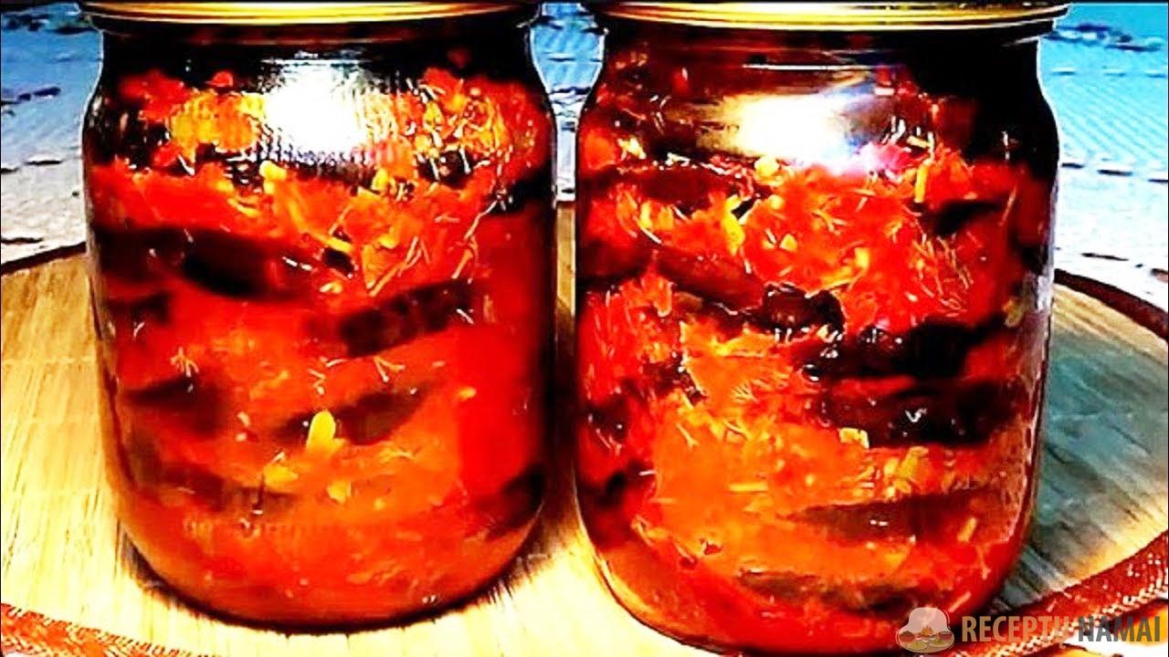 Baklažanus ir padažą sluoksniais paskleiskite sterilizuotuose stiklainiuose