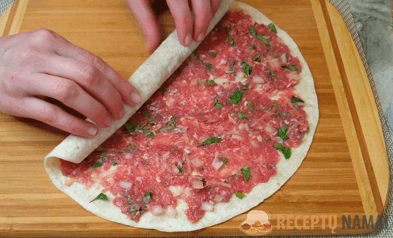 Įdarą tolygiai paskirstykite ant tortilijos ar pitos duonos.