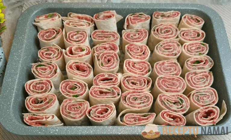 Tada suvyniokite į ritinį ir supjaustykite porcijomis.