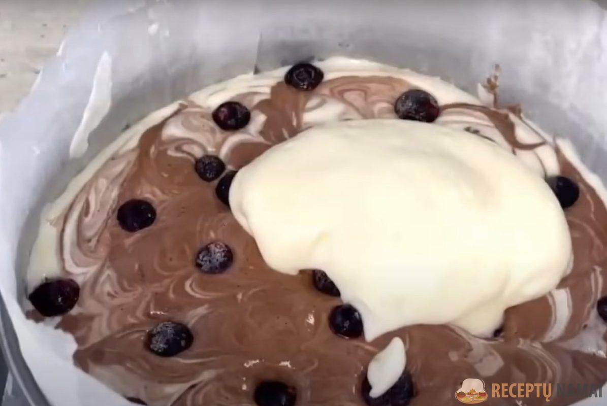 Tada sluoksnį uždenkite balta tešla ir vėl šokoladine tešla