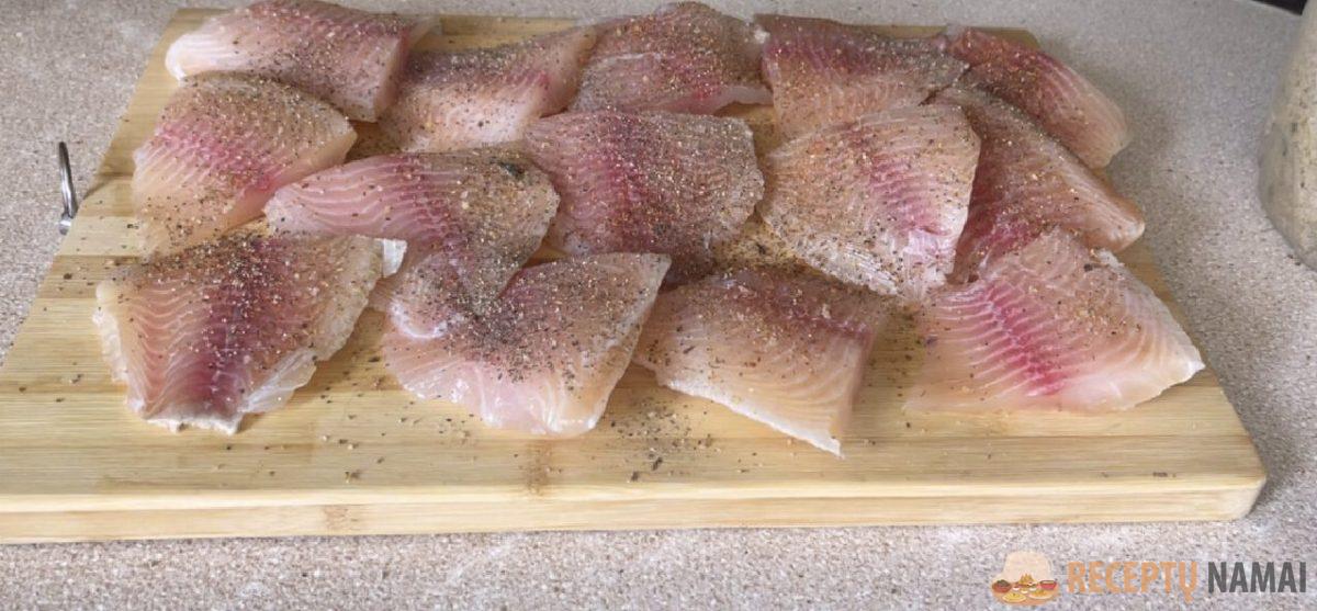 Galima naudoti bet kokią žuvį. Pirmiausia svarbu ją tinkamai pamarinuoti. Sudėkite žuvies gabalėlius į dubenį ir pabarstykite prieskoniais, druska ir pipirais. Ant viršaus supilkite citrinos sultis. Apibarstykite mėsą prieskoniais ir palikite pusvalandžiui