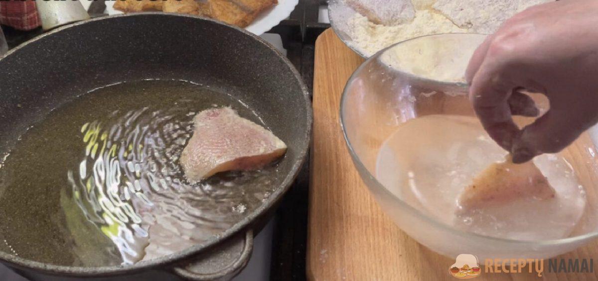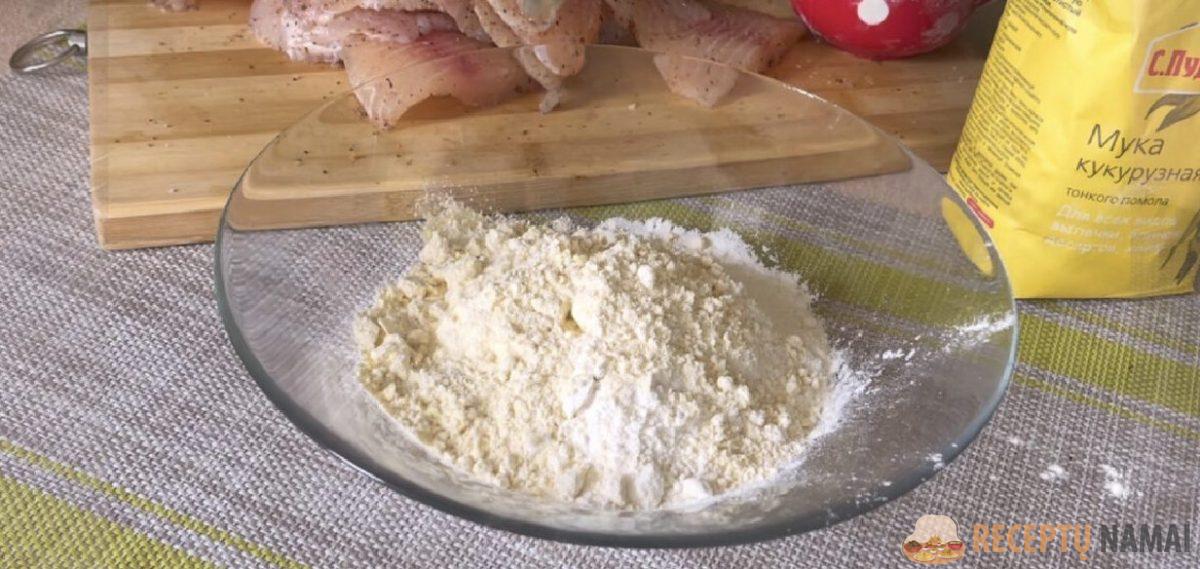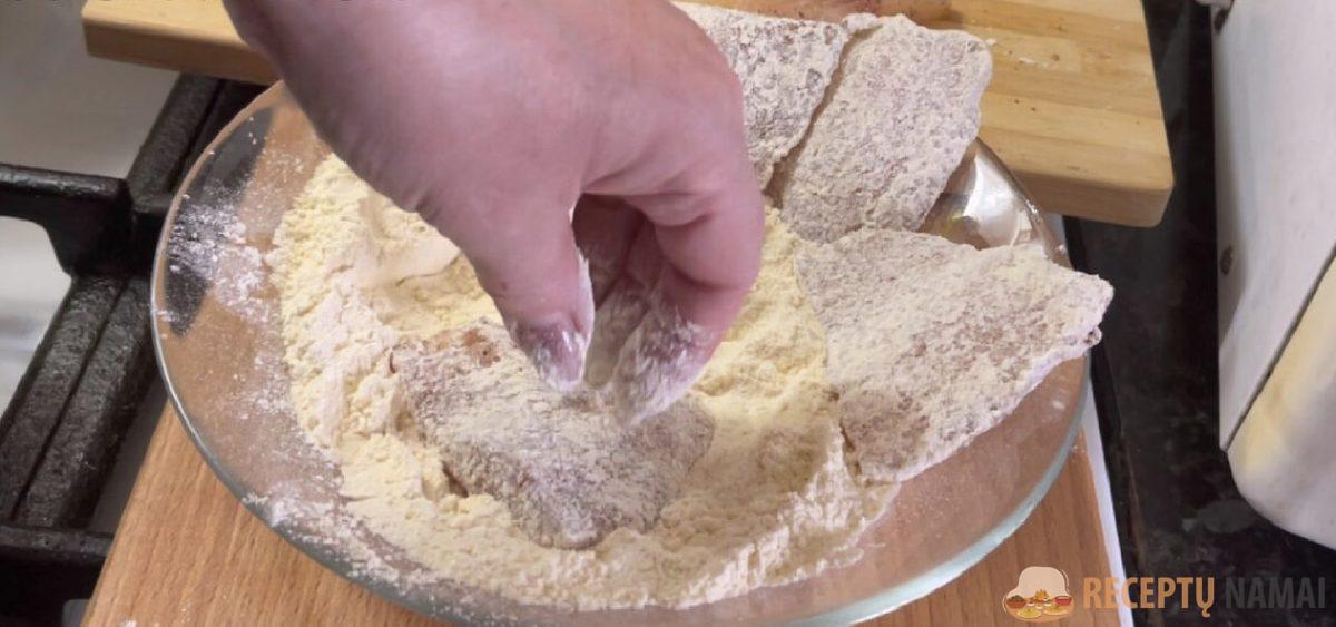 Lygiomis dalimis sumaišykite paprastus ir kukurūzų miltus. Apvoliokite žuvį šiame mišinyje. Perkelkite gabalėlius į šaltą verdantį vandenį. Panardinkite ir iš karto perkelkite į įkaitintą keptuvę su aliejumi. Neliks purslų ir miltai nepradės degti.