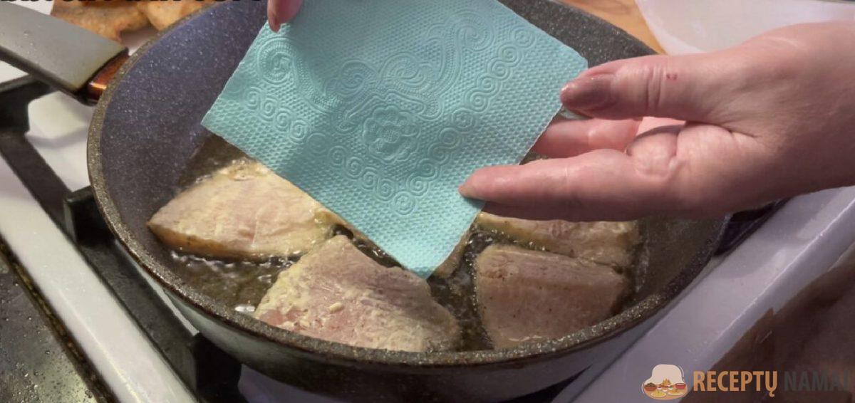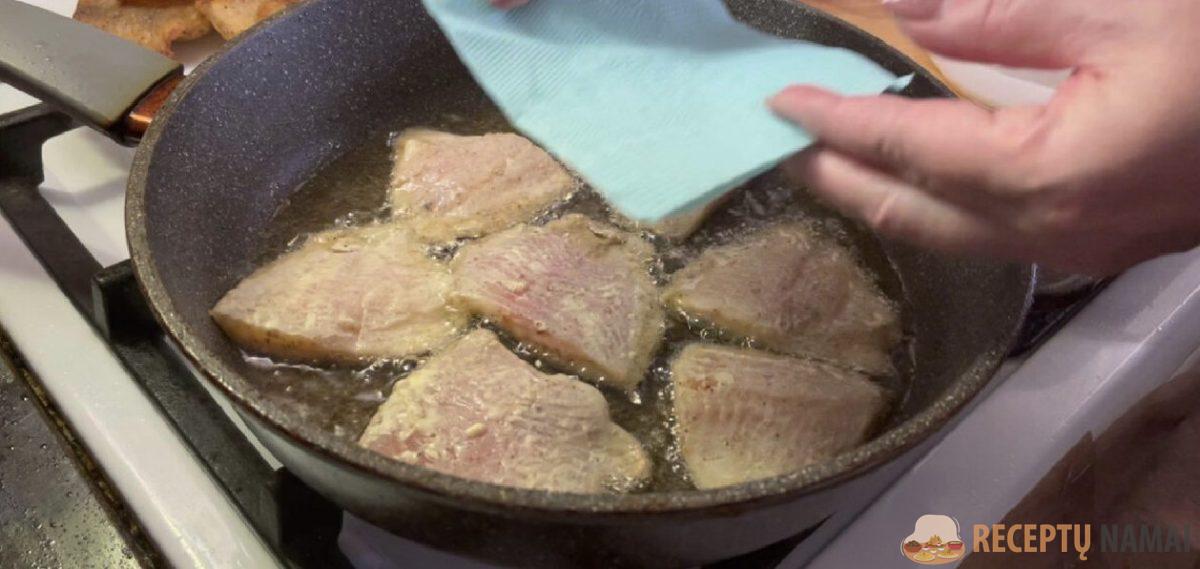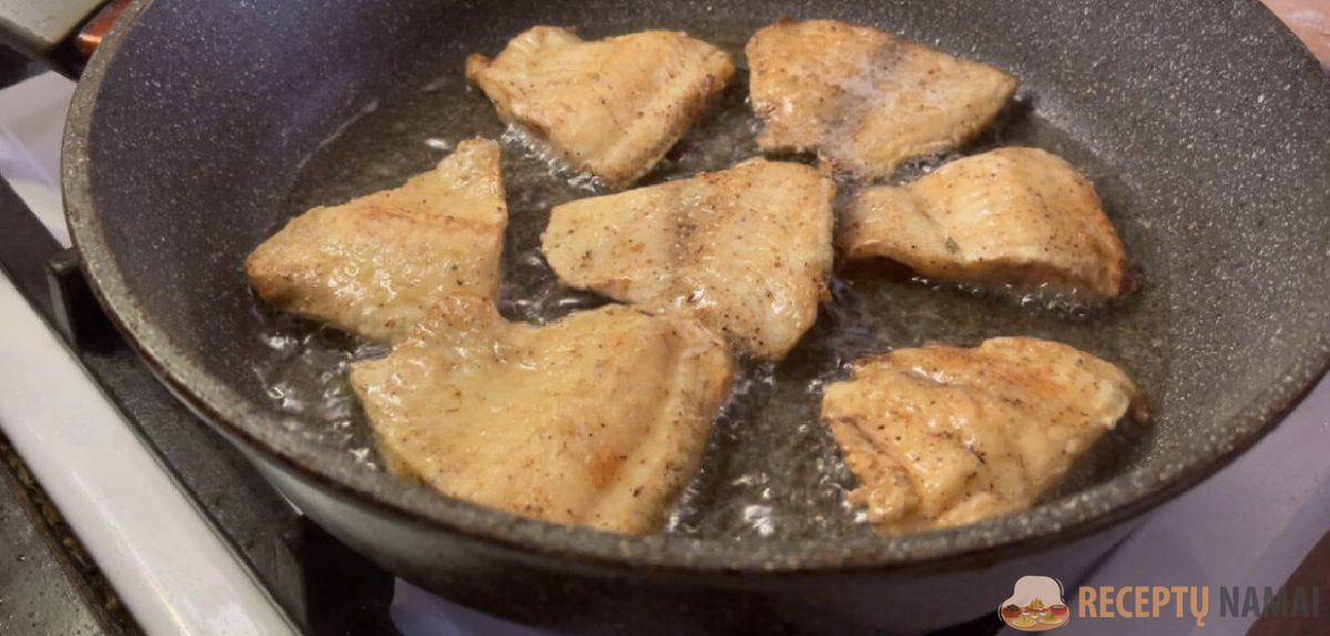 Sumažinkite kaitrą iki vidutinės ir kepkite, kol paruduos. Žuvis bus labai sultinga, minkšta ir su traškiu kiautu