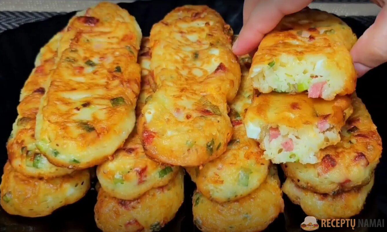 Gauname skanius paprastus paplotėlius su dešra, sūriu ir svogūnais.