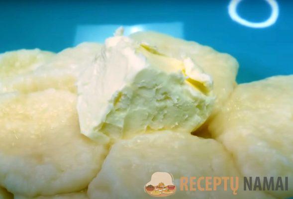 . Į tešlą įmaišykite dešrą, sūrį, svogūnus ir kiaušinius