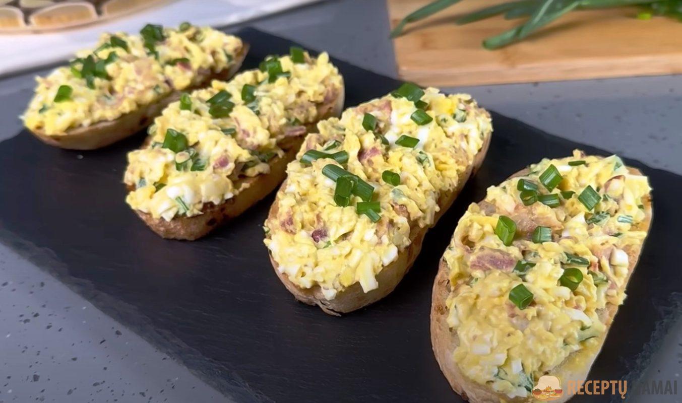 kiaušinius. Kietai virtus kiaušinius sutarkuokite stambia tarka, šoninę supjaustykite. Į kiaušinius sudėkite šoninę, susmulkinkite žaliąjį svogūną.