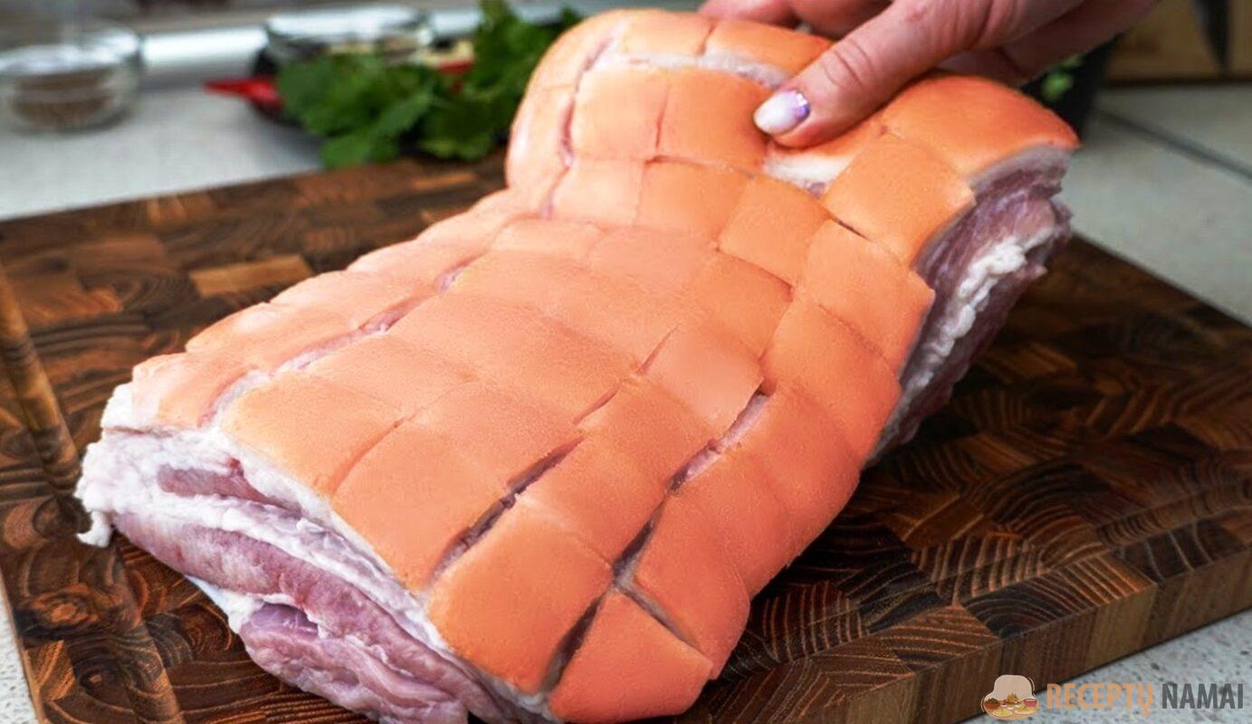 Vienoje krūtinėlės pusėje padarome kvadratinius įpjovimus ir ištepame druska.