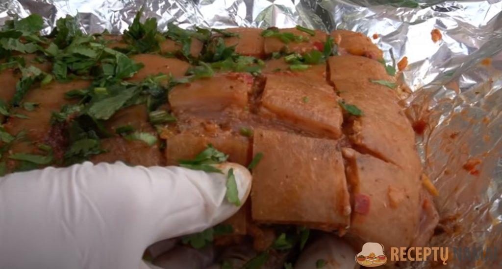 Suvyniojame į foliją ir marinuojame apie 4 valandas, o geriau – visą naktį.