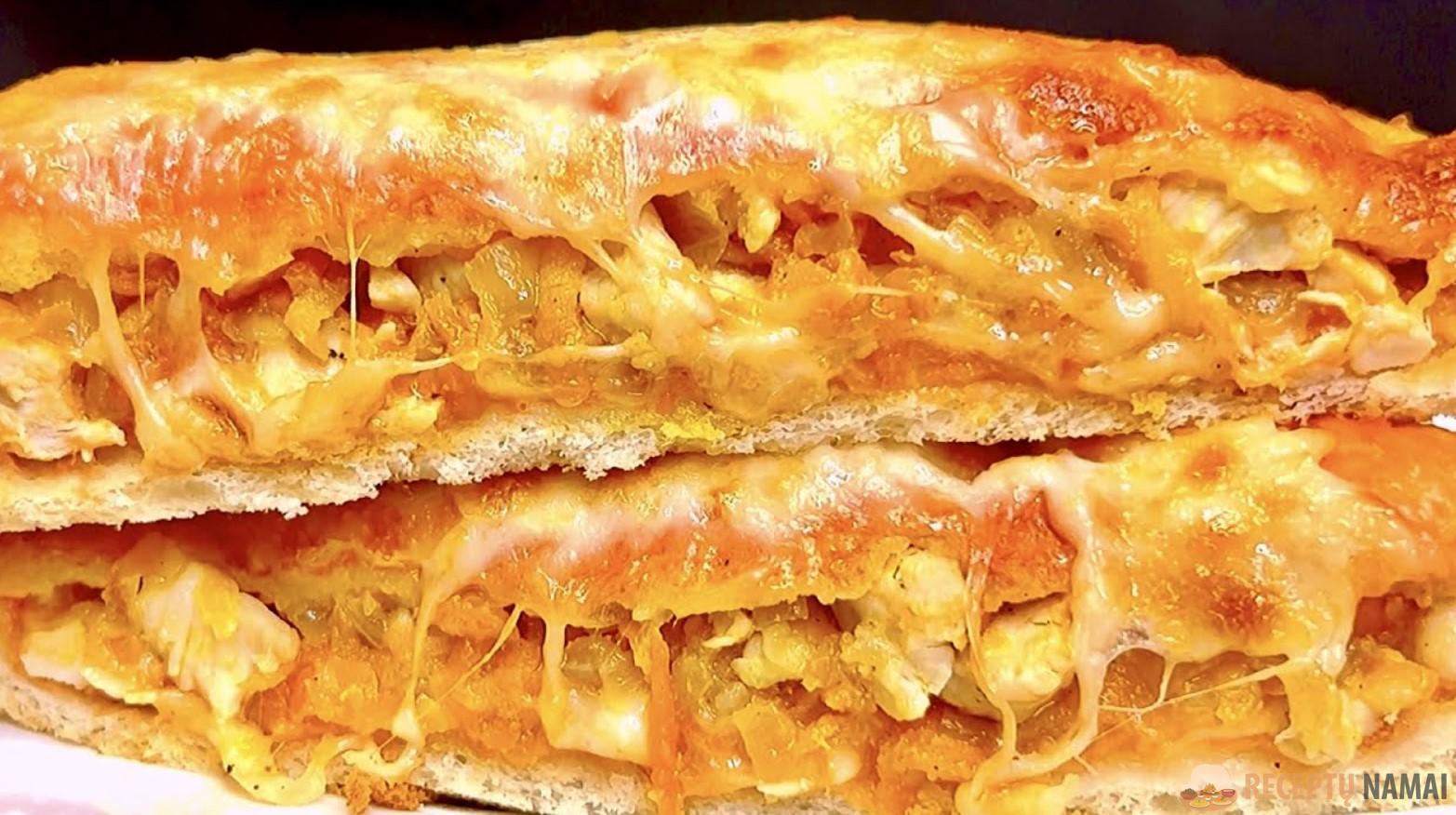 . Padalykite tešlą į dvi dalis. Vieną iš tešlos dalių iškočiokite ant kepimo skardos. Prieš tai kepimo skardą išklokite pergamentu