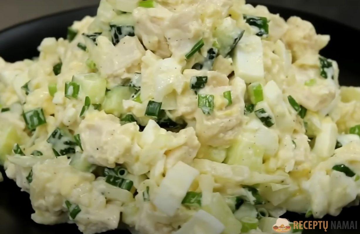 . Nusunkite marinatą nuo svogūnų ir sumaišykite jį su vištienos krūtinėle. Nedideliais kubeliais supjaustykite agurką, virtus kiaušinius, susmulkinkite žaliąjį svogūną