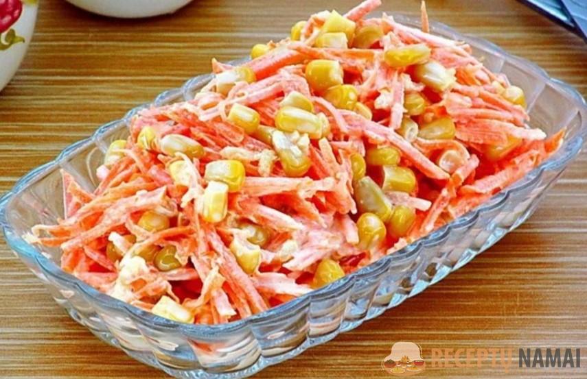 Atvėsiname visą masę, sumaišome su kukurūzais, užpilame majonezu ir dedame į šaldytuvą 30 minučių. Šios salotos labai skanios, kai yra šaltos.