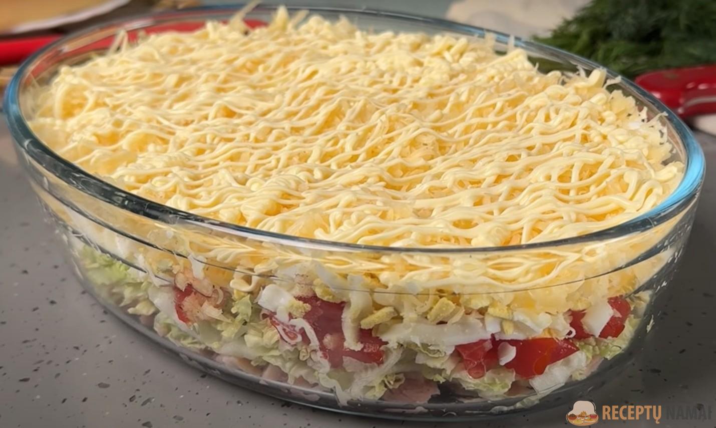 Į salotas pagal skonį galima įdėti šiek tiek sūrio, prieš tai jį sutarkuojant tarkavimo mašinėle.