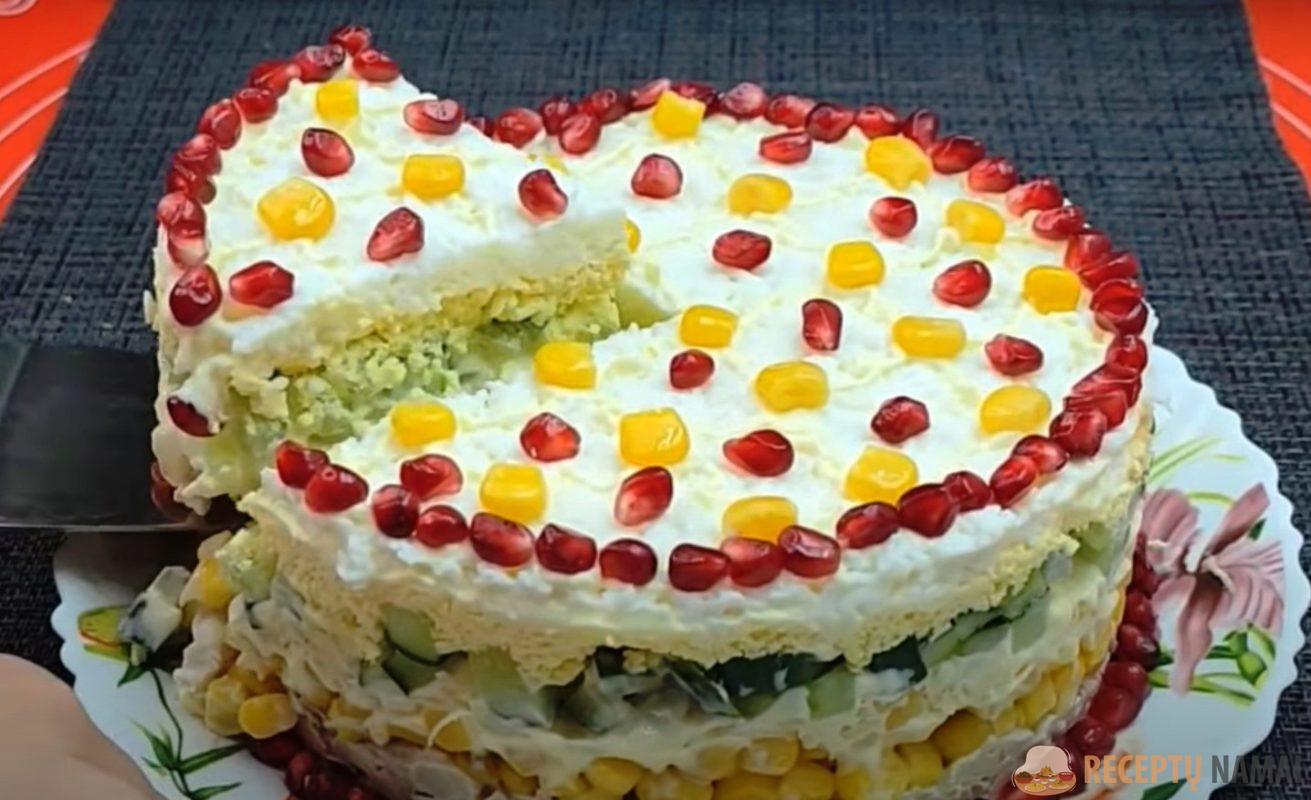Iškepusias salotas galite papuošti majonezu, granatų branduoliais ir kukurūzais.