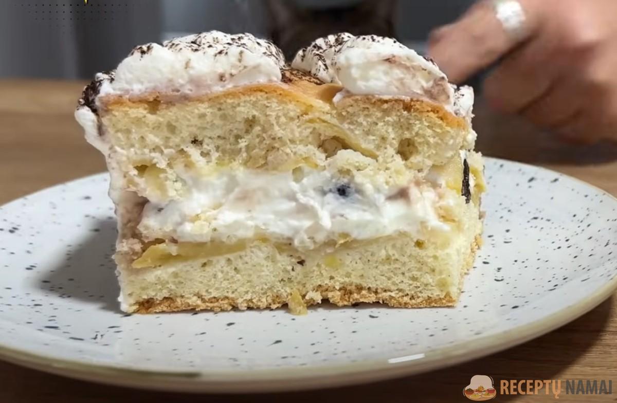 Nupjaukite nelygius biskvito kraštus ir padalykite jį į dvi dalis. Kremu aptepkite abu tortus, ypač tą dalį, kurioje yra obuolių sluoksnis