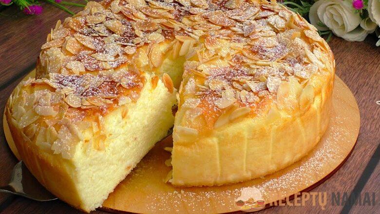 Paimkite 20 cm skersmens kepimo indą ir išklokite jį popieriumi. Supilkite mišinį, išlyginkite ir apibarstykite pjaustytais migdolais. Dėkite į 160 laipsnių įkaitintą orkaitę ir kepkite 50-60 minučių. Tada palikite visiškai atvėsti orkaitėje.