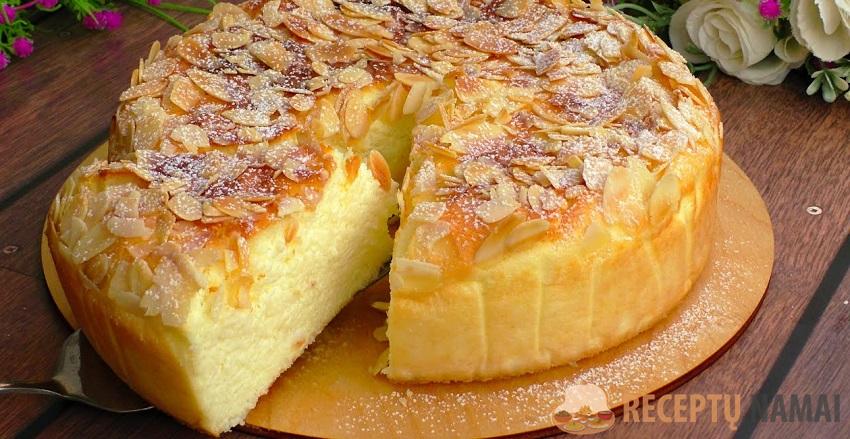 Paimkite 20 cm skersmens kepimo indą ir išklokite jį popieriumi. Supilkite mišinį, išlyginkite ir apibarstykite pjaustytais migdolais. Dėkite į 160 laipsnių įkaitintą orkaitę ir kepkite 50-60 minučių. Tada palikite visiškai atvėsti orkaitėje.