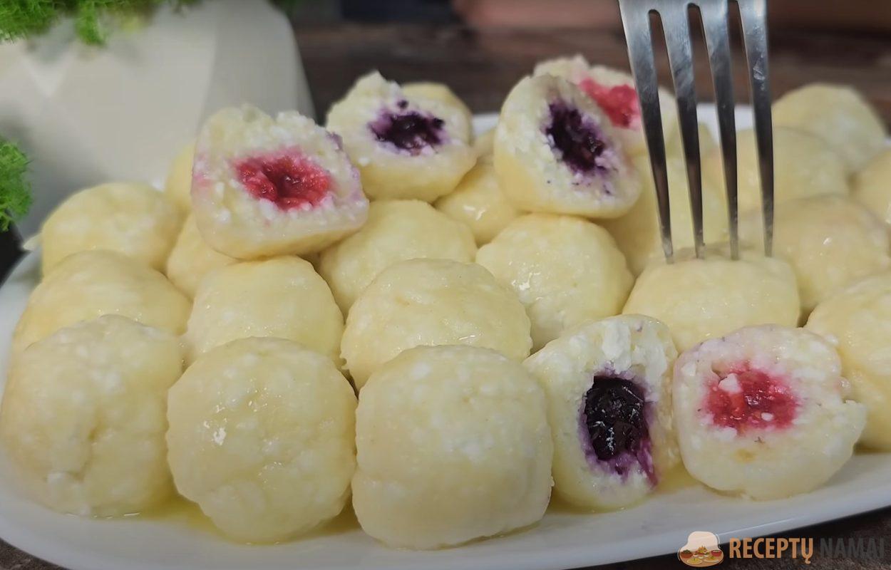 Išminkykite didelius varškės gabalus, įberkite druskos, cukraus, įmuškite kiaušinį, išmaišykite. Į mišinį supilame miltus ir manų kruopas, užminkome minkštą ir šiek tiek lipnią tešlą
