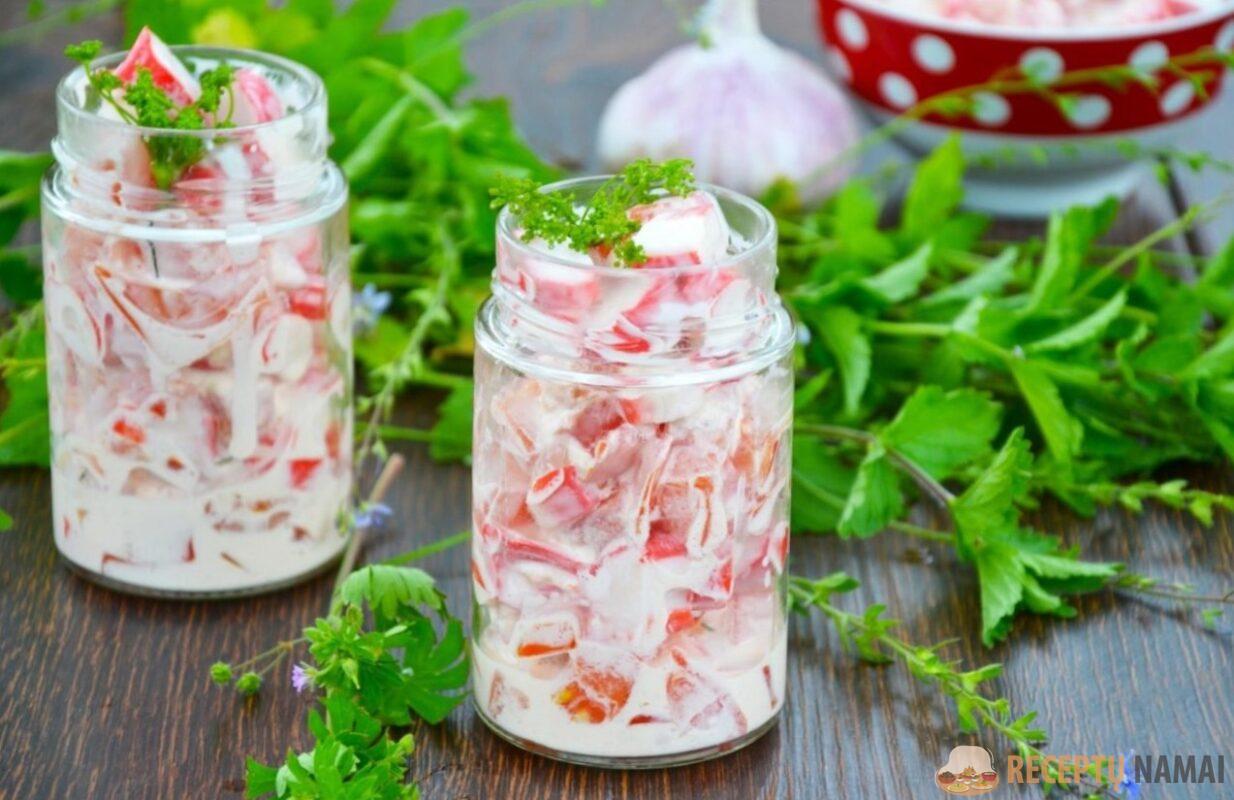 Jei nusibodo gaminti įprastas krabų salotas su lazdelėmis, galime pasiūlyti krabų salotas su pomidorais.