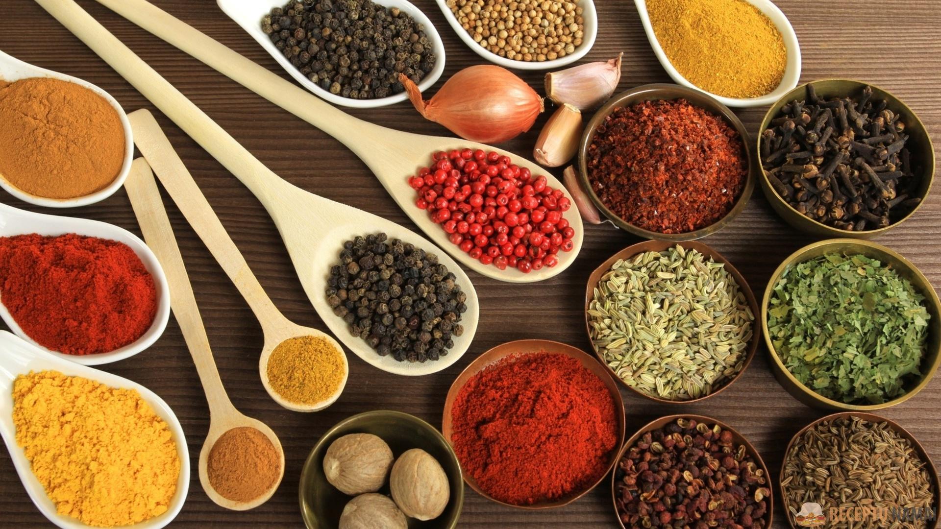 Raudonieji pipirai, kvapieji pipirai, kardamonas, čiobreliai, mairūnas, muskatas ir muskato riešutas, kmynai, imbieras, aitrioji paprika.