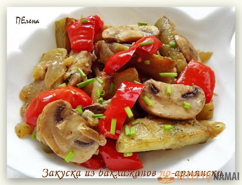 Užkandis paruoštas patiekti. Šis patiekalas pasižymi sodriu skoniu ir aromatu, kurį įvertins baklažanų mėgėjai.