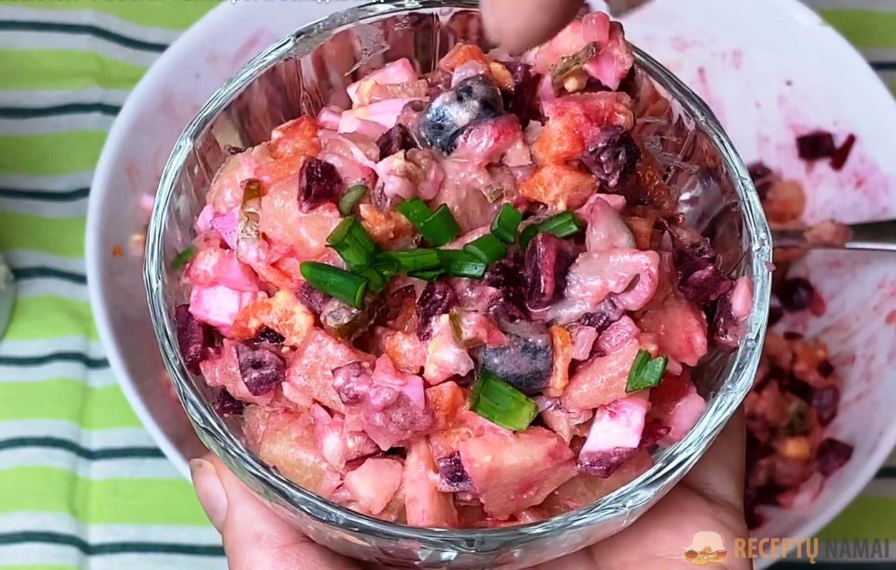 Užpilkite salotas majonezu ir gerai išmaišykite.