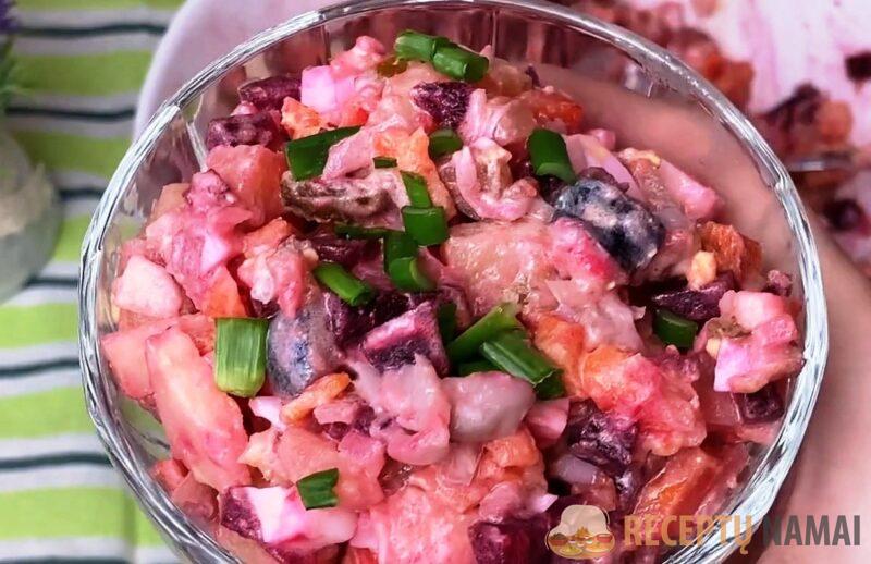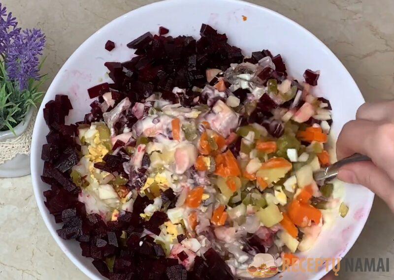 Nuluptą obuolį ir virtą burokėlį taip pat supjaustyti mažais kubeliais. Silkės filė smulkiai supjaustykite, sudėkite į morkų, bulvių, kiaušinių, burokėlių, svogūnų, marinuotų agurkų ir obuolių mišinį.