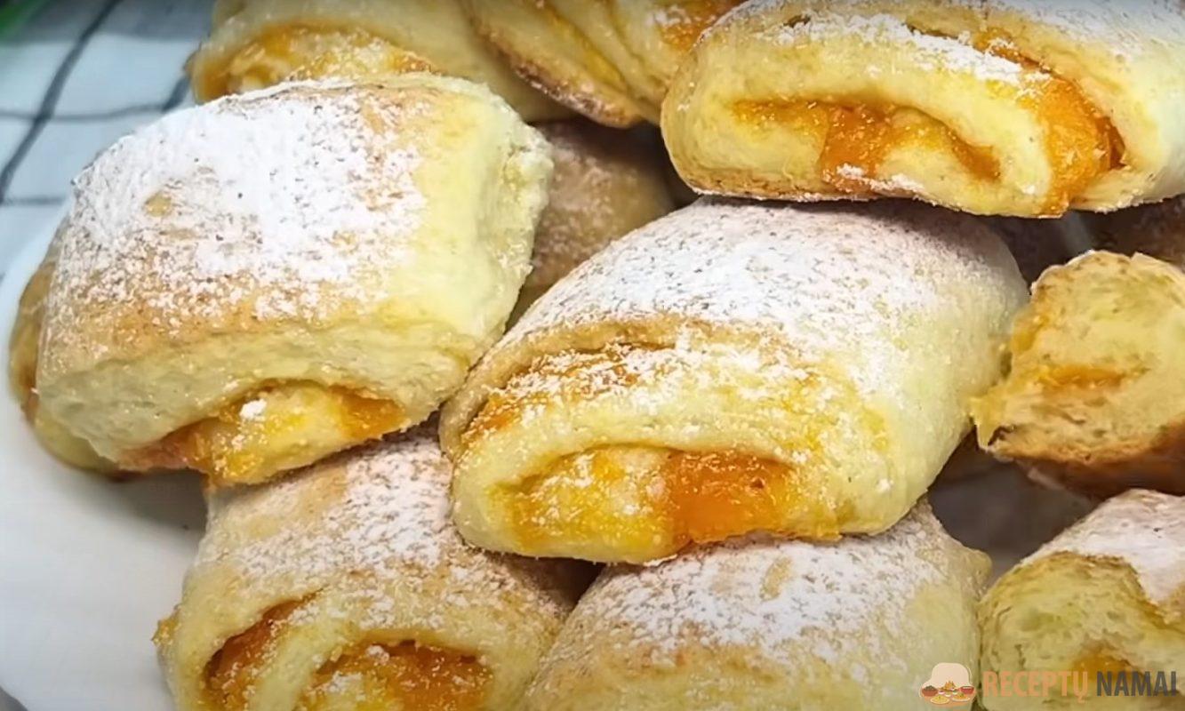 Iškepusius bandeles galima apibarstyti cukraus pudra. Šiam receptui tinka bet kokia uogienė pagal jūsų skonį.