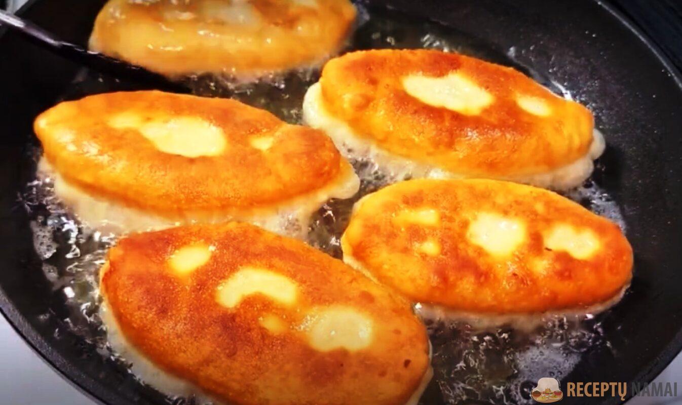 . Ant viryklės uždėkite keptuvę ir įpilkite daug augalinio aliejaus. Dėkite pyragėlius ir kepkite ant vidutinės ugnies, kol taps auksinės spalvos. Tada juos apverskite.