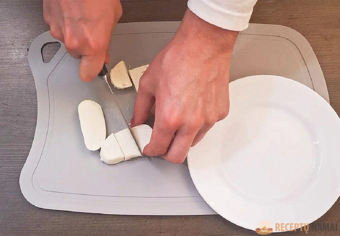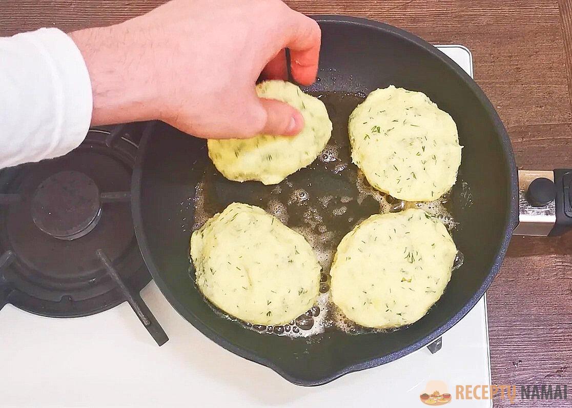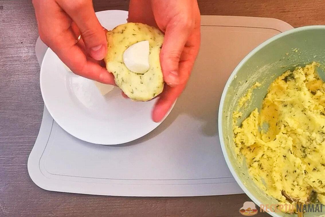 Sūrį reikia supjaustyti nedideliais gabalėliais ir galima formuoti zrazus. Kad tešla nesuliptų, rankos turi būti drėgnos. Prieš gamindami naują partiją, pamirkykite jas vandenyje. Iš tešlos iškočiokite rutuliukus, tada padarykite plokštainį su sūriu viduryje.