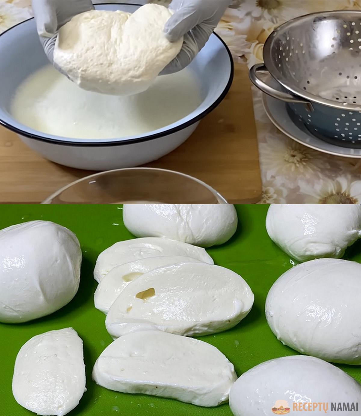 Pieną geriau vartoti ne ilgai laikytą ir ne itin pasterizuotą. Jį reikia supilti į puodą ir pašildyti iki 50 laipsnių. Kai tik temperatūra pasieks reikiamą ribą, nukelti puodą nuo ugnies ir palaipsniui įpilti citrinos rūgšties visą laiką maišant. Tuoj pat pastebėsite, kaip pienas rūgsta: susidaro tiršta masė ir išsiskiria išrūgos. Palikite pastovėti 10 minučių, tada pieną surinkite ir išspauskite skysčio perteklių. Supilkite jį į sietelį ir pradėkite minkyti kaip tešlą. Kuo ilgiau minkysite ir trauksite, tuo elastingesnis bus sūris.