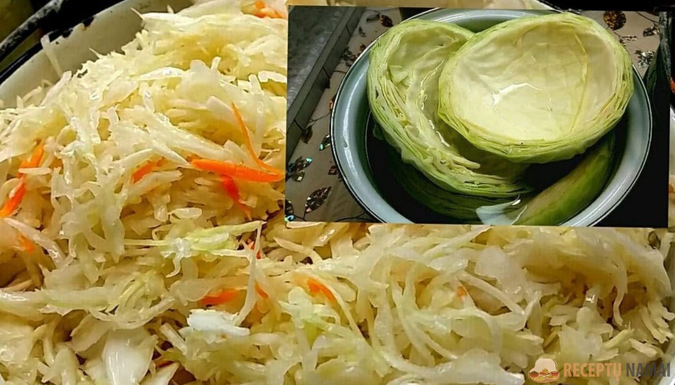 kryžmai, t. y. nuo kopūstų paviršiaus nupjautus lapus, sudėkite į gilų puodą ir užpilkite pasūdytu vandeniu. Į 1 litrą vandens įberiame 40 g druskos