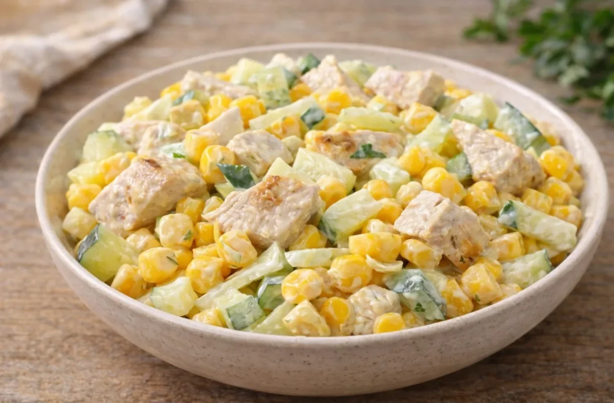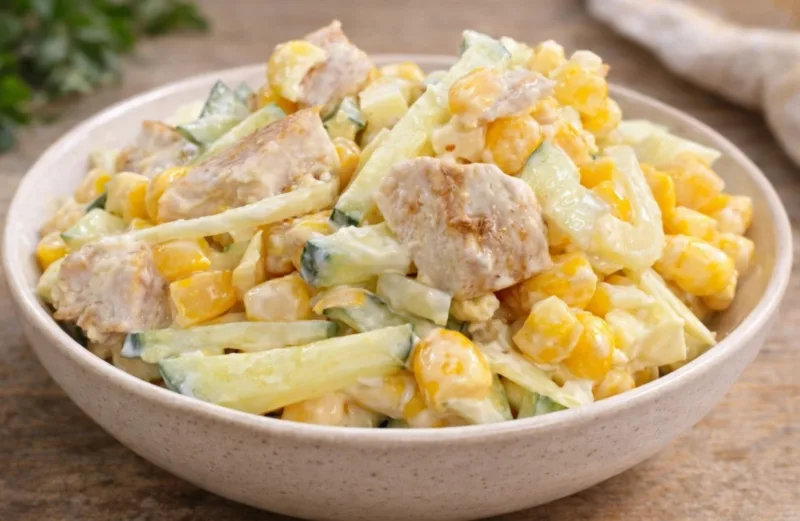 - Pusę agurko supjaustykite strypeliais, kartu su kukurūzais sudėkite į salotas.