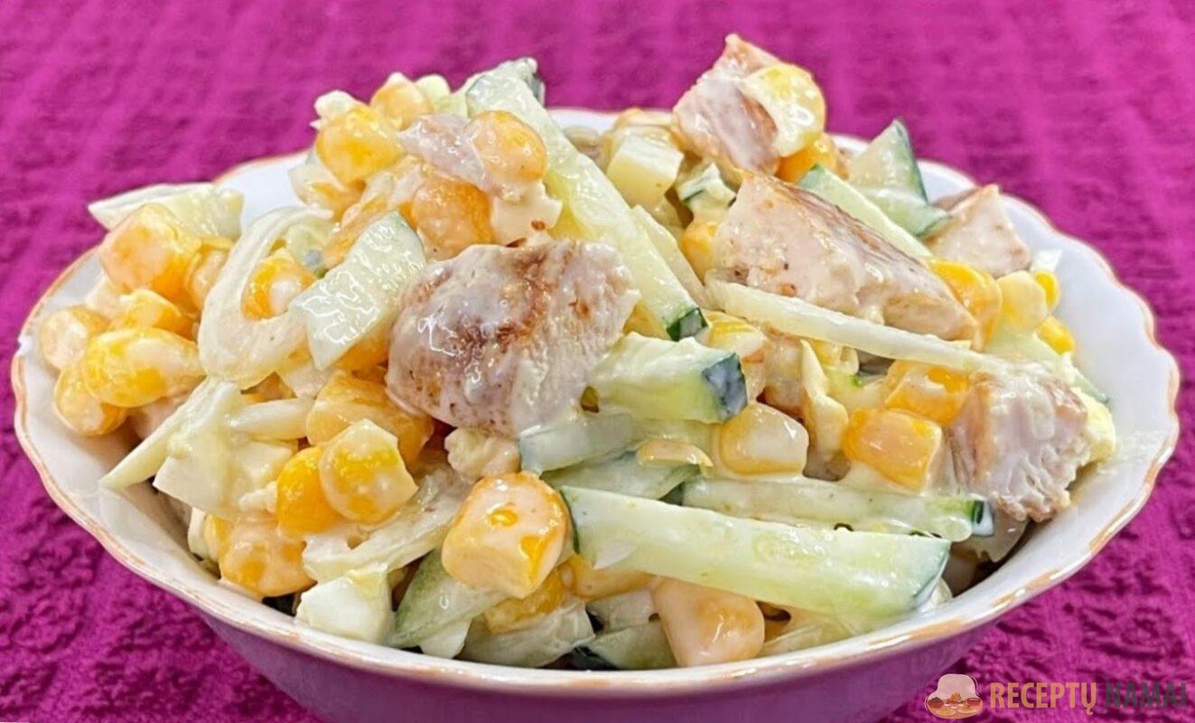 . Supjaustykite plonais žiedais svogūnus, sudėkite į salotas. Pusę agurko supjaustykite juostelėmis, kartu su kukurūzais sudėkite į salotas.