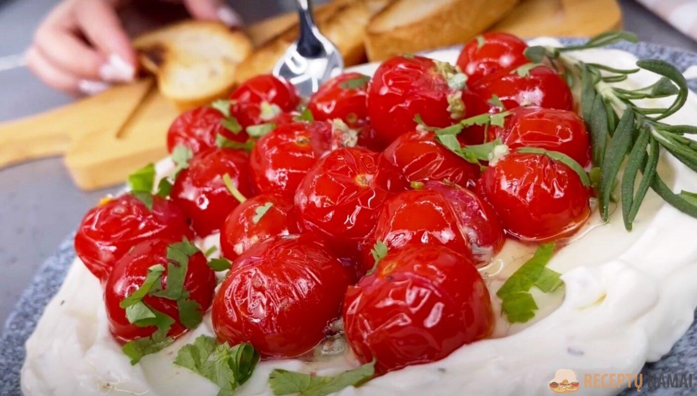. Prie pomidorų pridėkite rozmarino lapelį arba šakelę, kepkite orkaitėje, kol bus paruošti. Tuo metu į trintuvą sudėkite fetos sūrį ir varškę, supilkite grietinėlę ir augalinį aliejų.