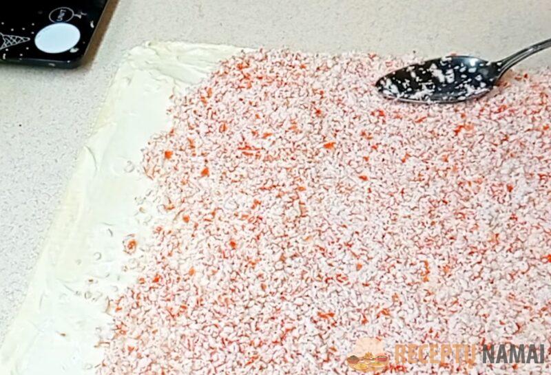 Sluoksnį apibarstykite smulkintomis krabų lazdelėmis. Tolimąjį kraštą palikite be krabų mišinio, maždaug 3-4 cm.