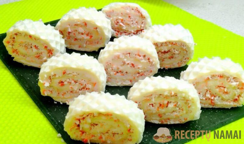 Paruoškime iš krabų lazdelių įdomų vyniotinį “Rožinis debesėlis”.