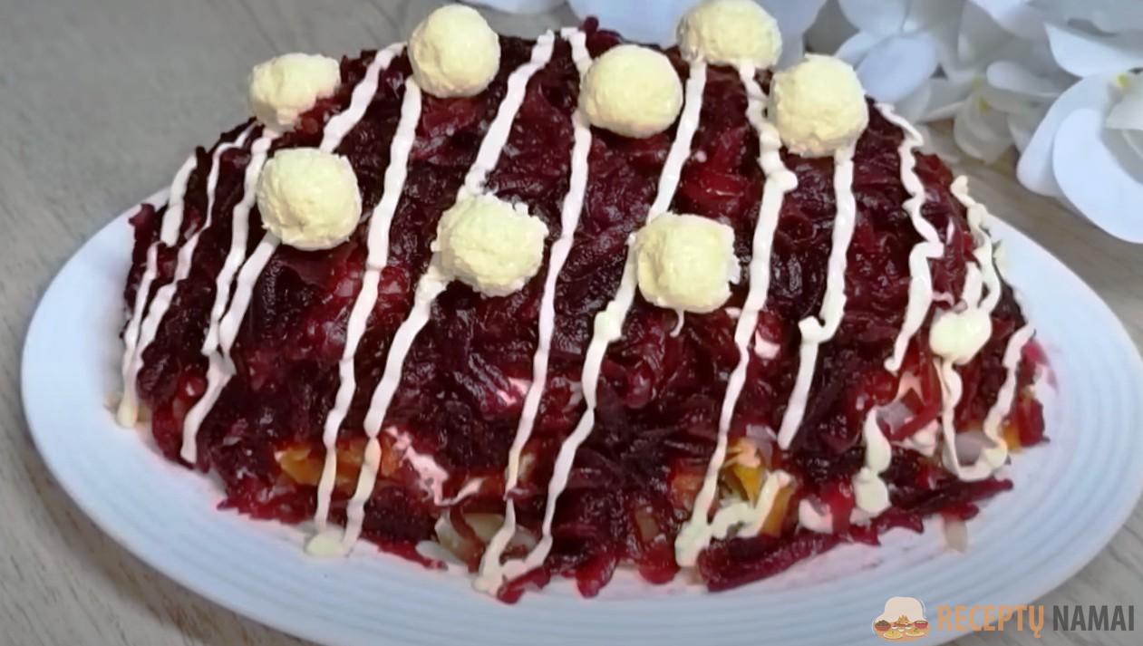 svogūnų sluoksnį ir apibarstykite jį bulvėmis. Bulvių sluoksnį aptepkite majonezu ir apibarstykite burokėliais.