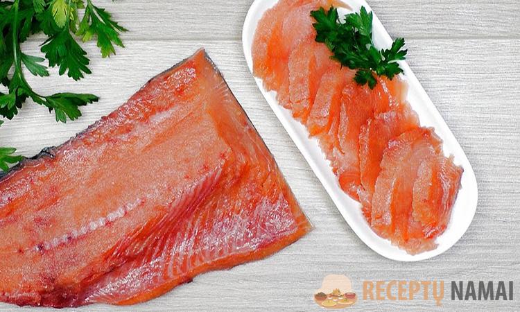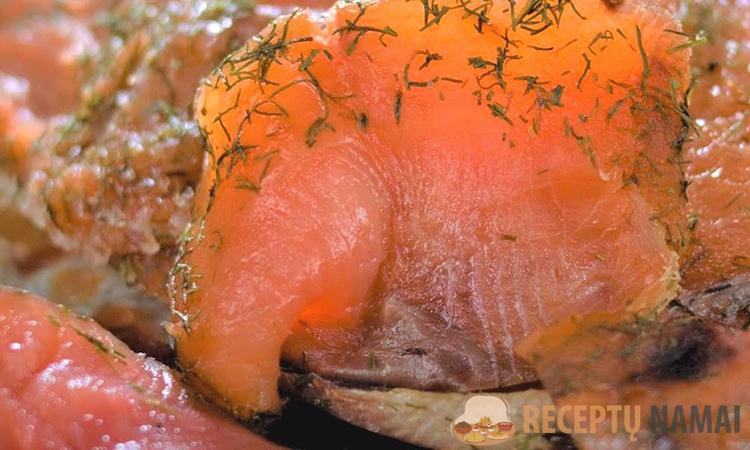 Ingredientai: 1 kilogramui rožinės lašišos reikia 3 šaukštų sausų krapų, 3 šaukštų stambios akmens druskos, tiek pat cukraus ir 100 mililitrų augalinio aliejaus.