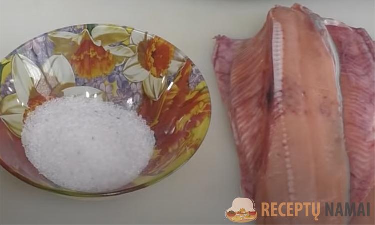 Žuvį išfiluojame, išimame galvą, pelekus ir viską, kas yra viduje. Skerdeną supjaustome į tris gana plonus sluoksnius. Dabar giliame, patogiame dubenyje sumaišykite druską, cukrų ir krapus. Gautame mišinyje pamerkite žuvį.