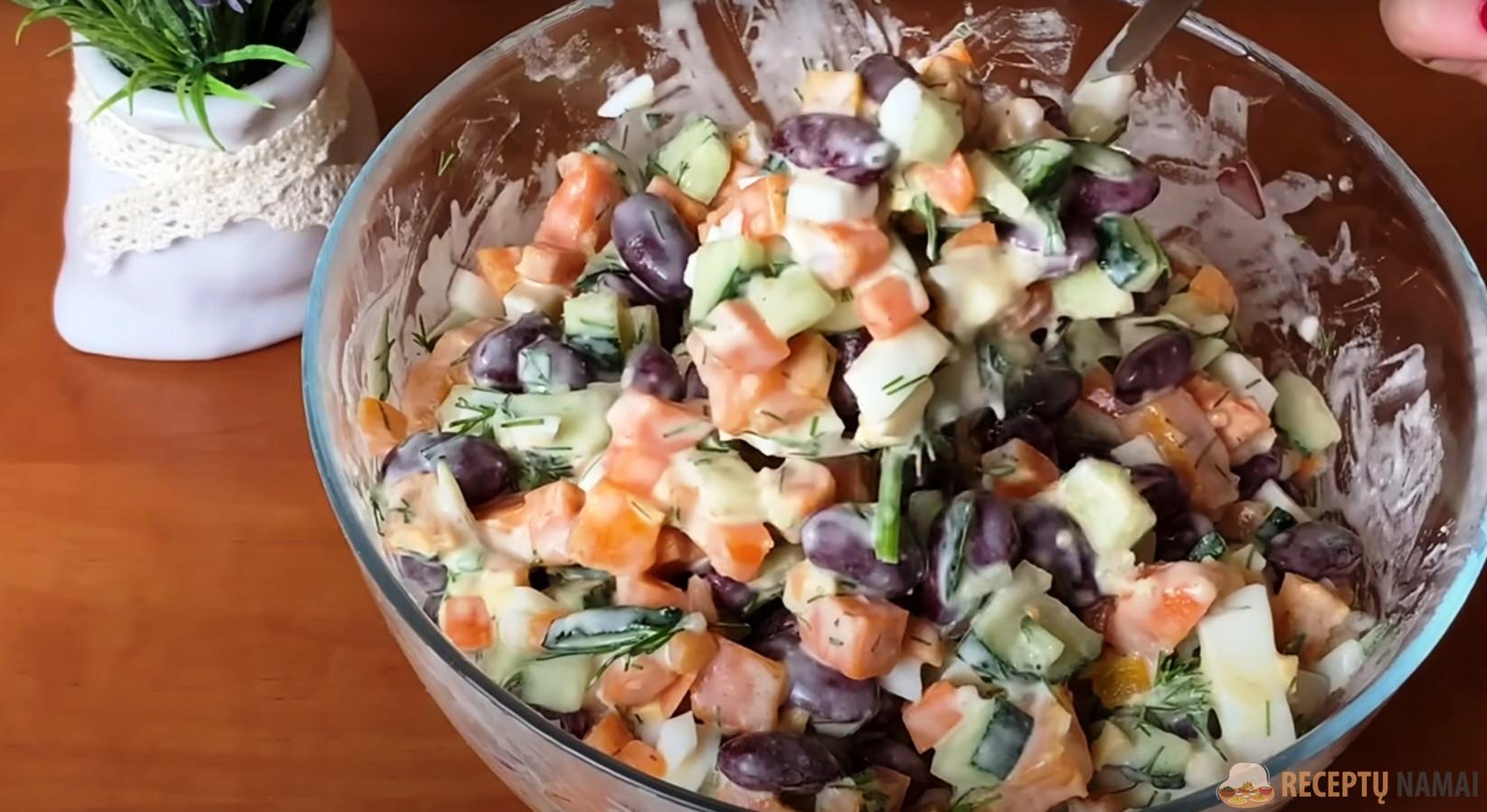. Sumaišykite susmulkintus komponentus, įmaišykite grietinę ir garstyčias, įberkite druskos. Supilkite citrinos sultis, įmaišykite įdarą.