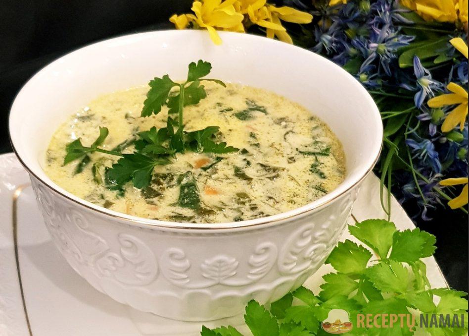 Norėdami paruošti padažą, atskirame dubenyje sumaišykite grietinę (arba paprastą jogurtą) su žaliais vištienos tryniais ir įpilkite kelis šaukštus karšto sultinio. Tada išmaišyti ir visą šią masę atsargiai maišant supilti į puodą su sriuba.