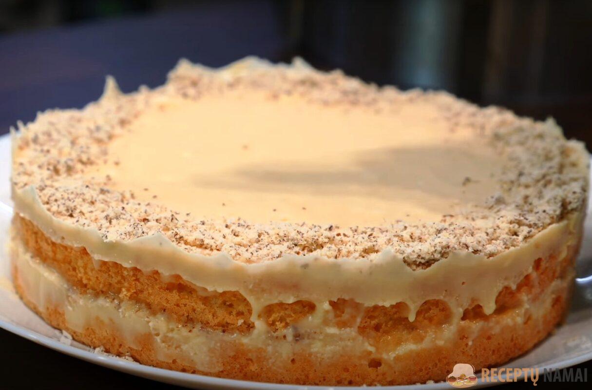 Biskvitą palikite 20 minučių atvėsti, tada padalykite į du pyragėlius. Pirmąjį pyragą aptepkite ½ kremo, apibarstykite smulkintais graikiniais riešutais.