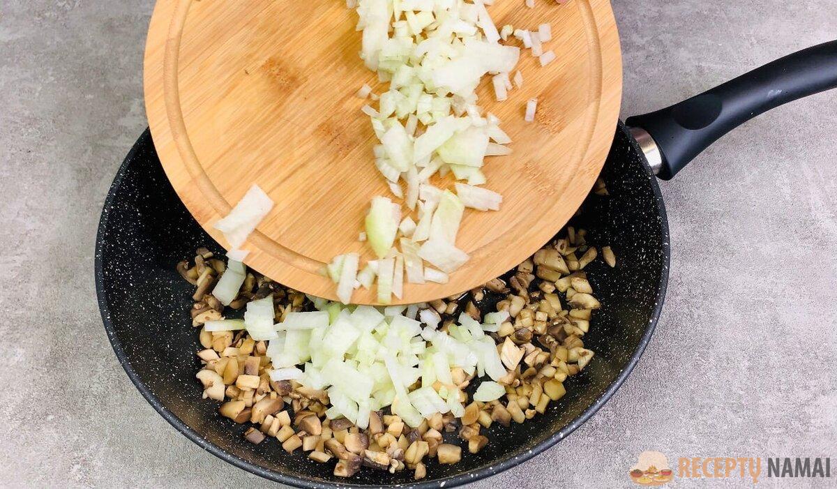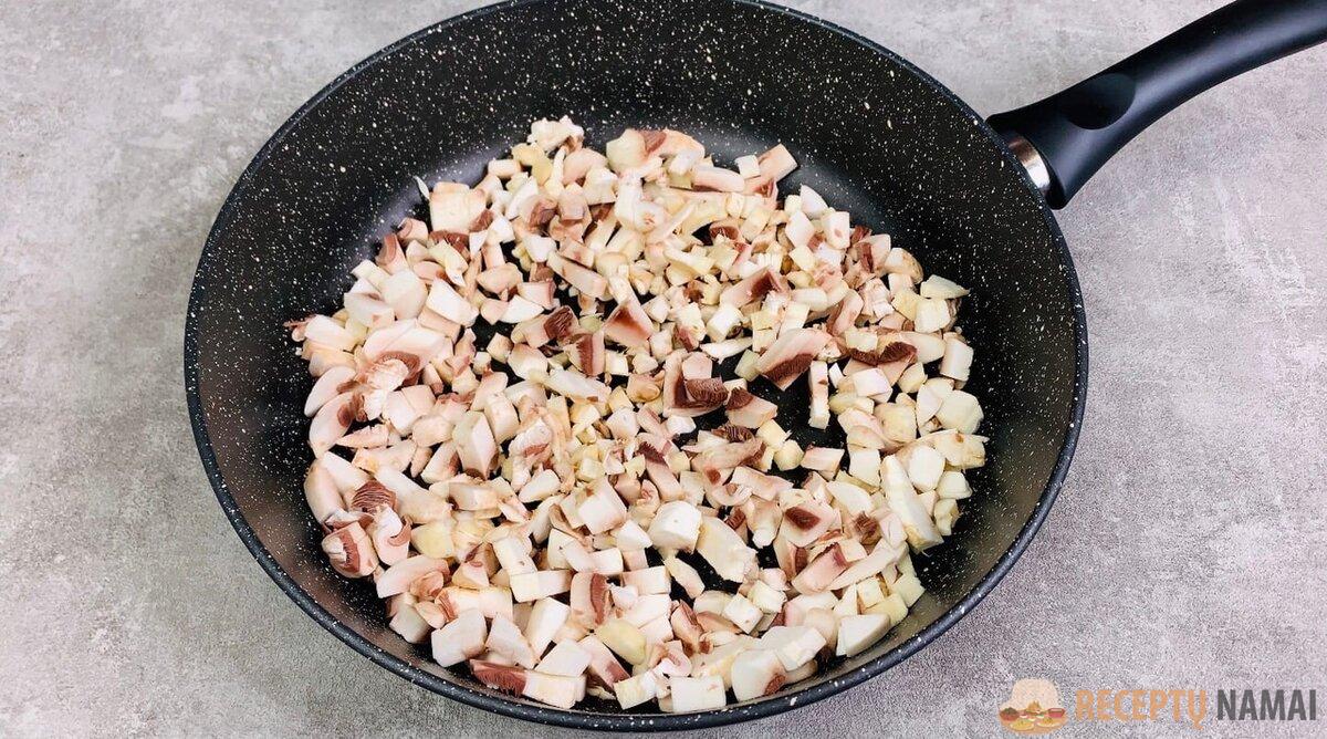 !2. Supjaustykite grybus mažais kubeliais ir siųskite juos kepti į sausą keptuvę, kol išgaruos skystis.