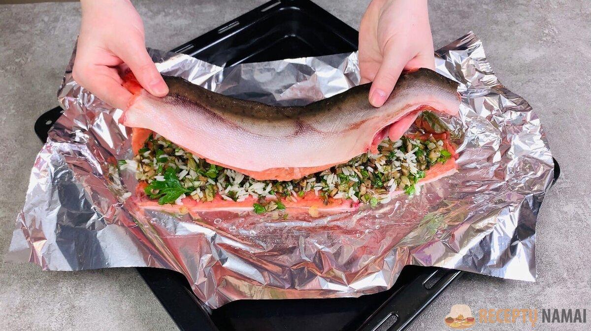 7. Paimkite kitą folijos lakštą, ištepkite jį augaliniu aliejumi ir ant viršaus uždenkite žuvį. Apvyniokite kraštus ir suteikite “kupolo” formą.
