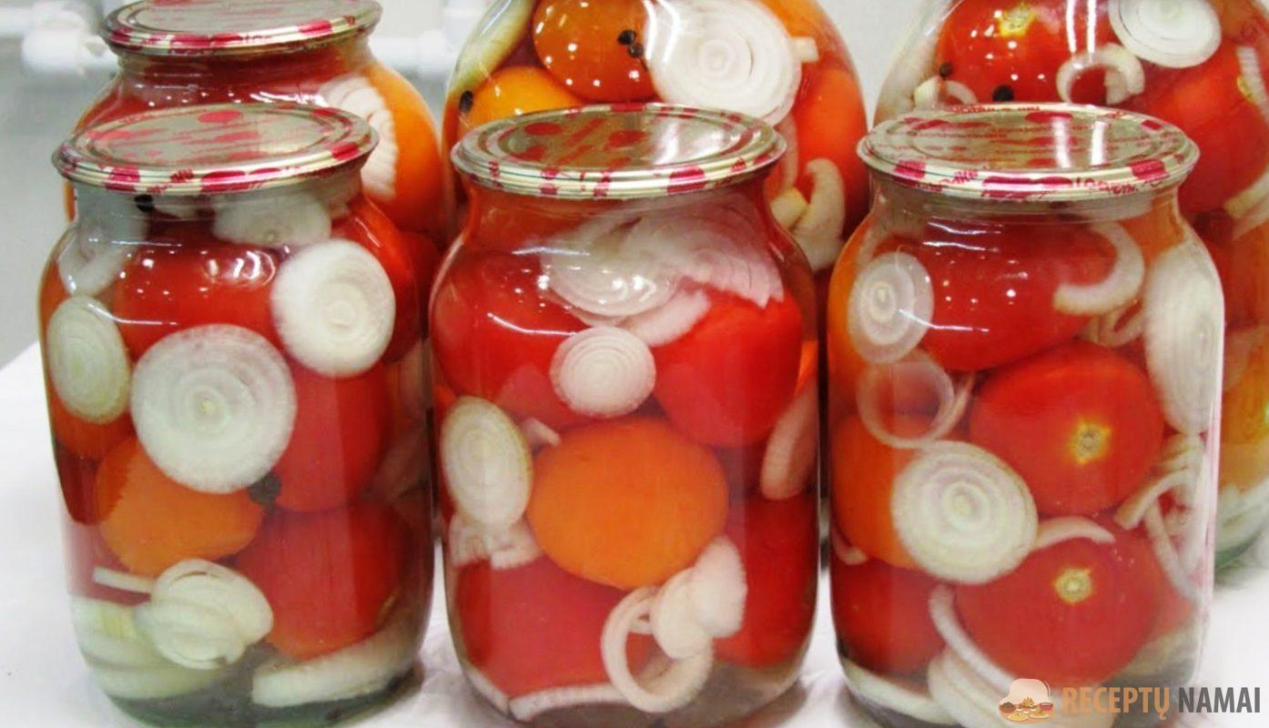 . Dideliame puode iš anksto užvirinkite vandenį. Į stiklainius sudėkite pomidorus, pakaitomis su svogūnų žiedais. Į stiklainius supilkite verdantį vandenį.