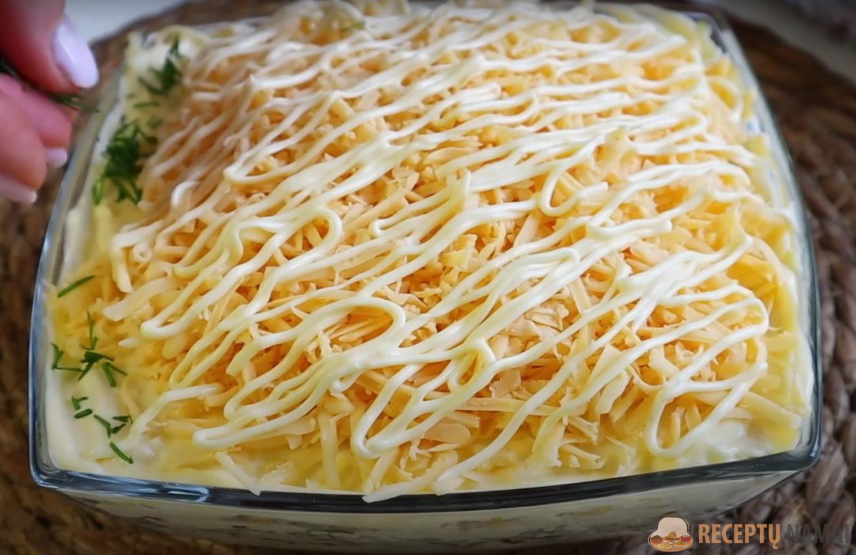 . Sudėkite obuolį ant kiaušinių sluoksnio, ištepkite majonezu. Smulkiai sutarkuokite sūrį ir pabarstykite juo salotų viršų.